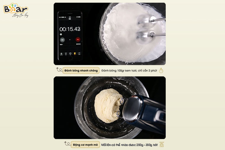 Chẳng hạn, với chức năng đánh trứng, đánh kem, máy đánh trứng cầm tay Bear sẽ giúp bạn đánh bông, đánh cứng kem tươi và lòng trắng trong thời gian ngắn nhất. Bạn có thể tham khảo các bước đánh kem hoặc đánh lòng trắng trứng theo các clip hướng dẫn. Tuy nhiên, hãy nhớ rằng, mỗi loại bánh sẽ có những yêu cầu khác nhau về chất lượng kem hay chất lượng kem lòng trắng trứng. Ví dụ: Với bánh bông lan, lòng trắng trứng đạt là cứng lại, có chóp nhọn khi nhấc que đánh ra khỏi hỗn hợp được đánh bông. Tuy nhiên, đối với bánh macaron, yêu cầu về mức độ bông của lòng trắng trứng chỉ là bông, xốp, mềm mại và không được quá cứng hay có chóp nhọn. Do đó, khi đã sử dụng máy đánh trứng cầm tay Bear, bạn nên làm thật nhiều loại bánh, sau đó, rút ra những kinh nghiệm từ những lần đó và ghi vào sổ. Chắc chắn, bạn sẽ thành công.