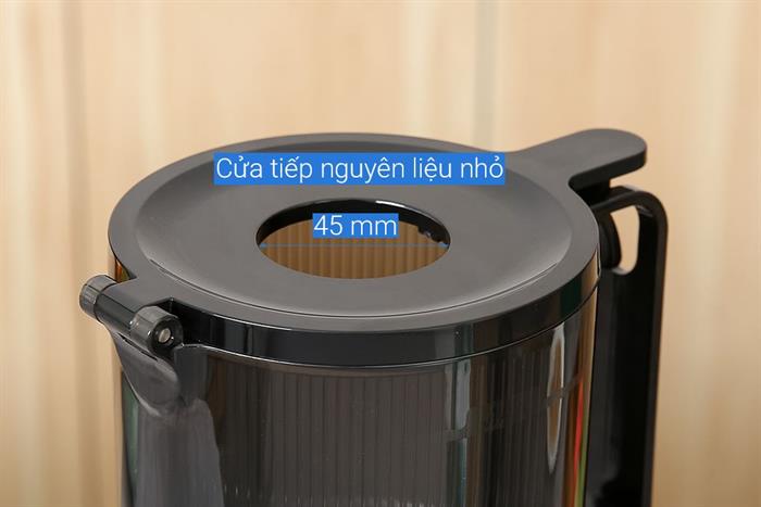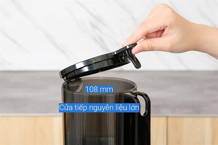 Máy ép trái cây có đường kính ống tiếp nguyên liệu nhỏ khoảng 45 mm và lớn khoảng 108 mm giúp dễ dàng cho cả quả táo, lê, cam nguyên trái mà không cần cắt nhỏ nhiều, tiết kiệm thời gian và công sức sơ chế.