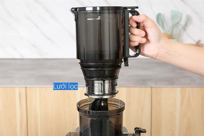 - Cối ép bằng nhựa cao cấp kèm lưới lọc mịn giúp phân tách hiệu quả bã và nước ép.