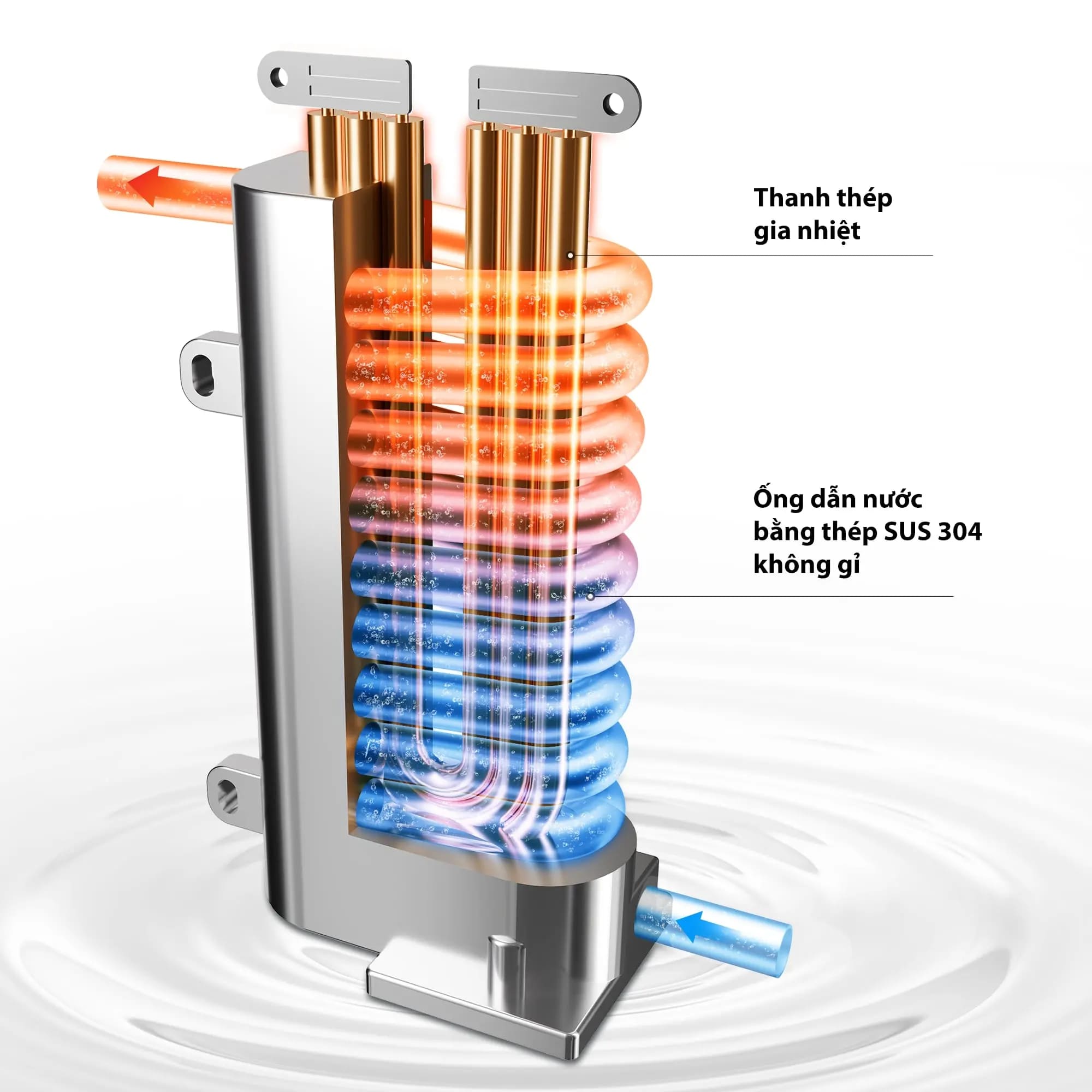 - Thanh nhiệt tách rời nguồn nước: Tự động điều chỉnh công suất làm nóng chính xác theo nhiệt độ mong muốn.